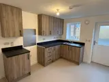 The kitchen consists of a range of modern wall and base units, modern work surfaces and sink drainer unit