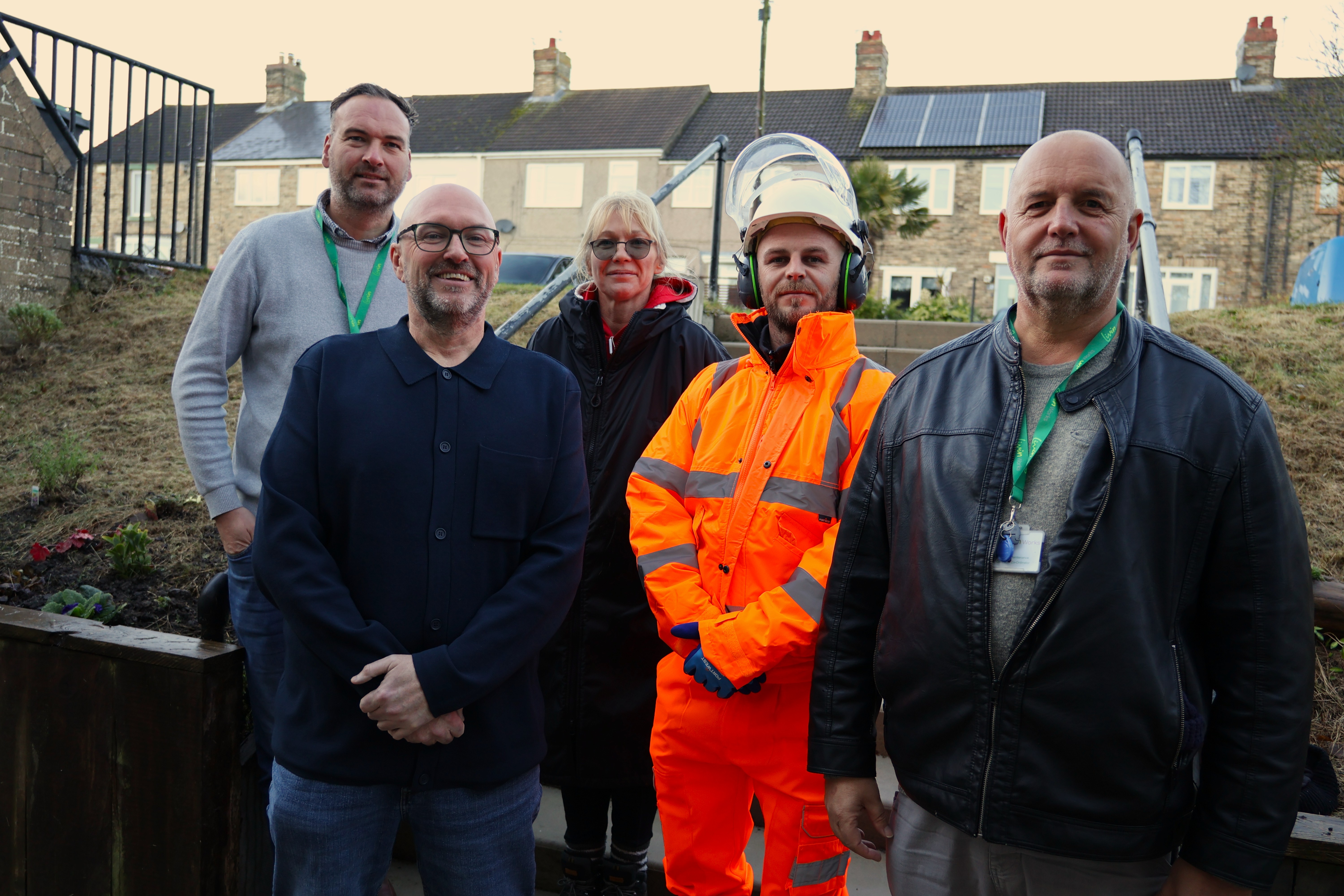 Pictured: Andrew Cassidy (Housing adviser), Malcolm Gray (Community Investment Manager), Elaine Webster (Director of Garden Creations), Anthony Sewell (tenant), and Colin Muir (Grounds Maintenance Contract Co-ordinator)